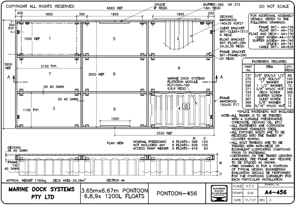 Drawing a4-0456 Pontoon 6.67 mtr x 3.65 (6, 9, 12 x 1200 Litre Floats)