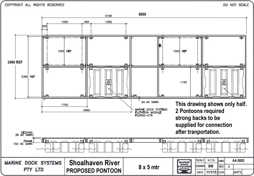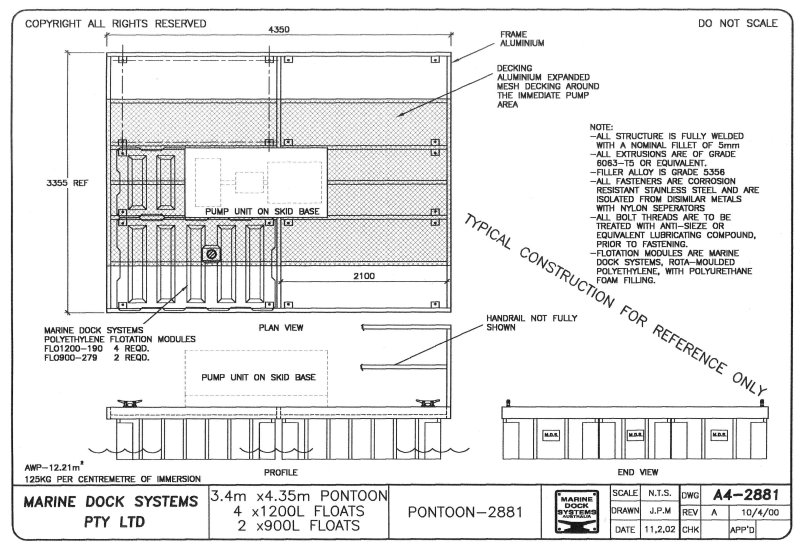 Drawing a4-0354 Pontoon 6 mtr x 3.46 (8 x 650 Litre Floats)