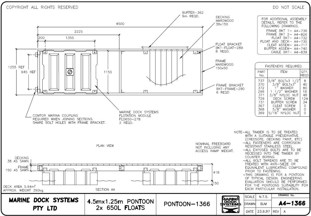 a4-1366 4.5m x 1.25m Timber walway pontoon (2 x 650 Litre Floats)