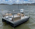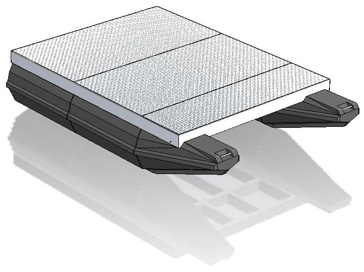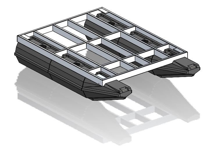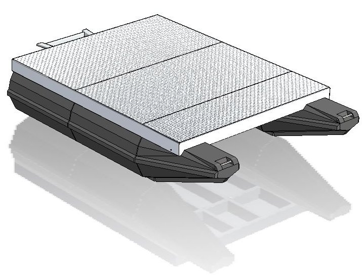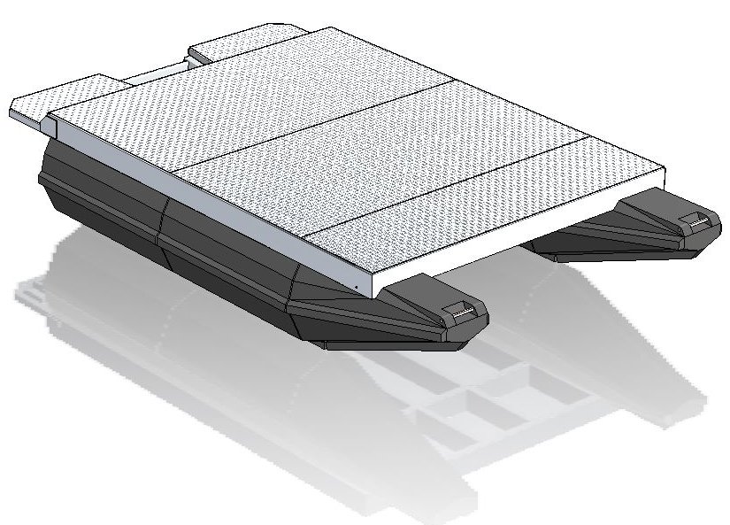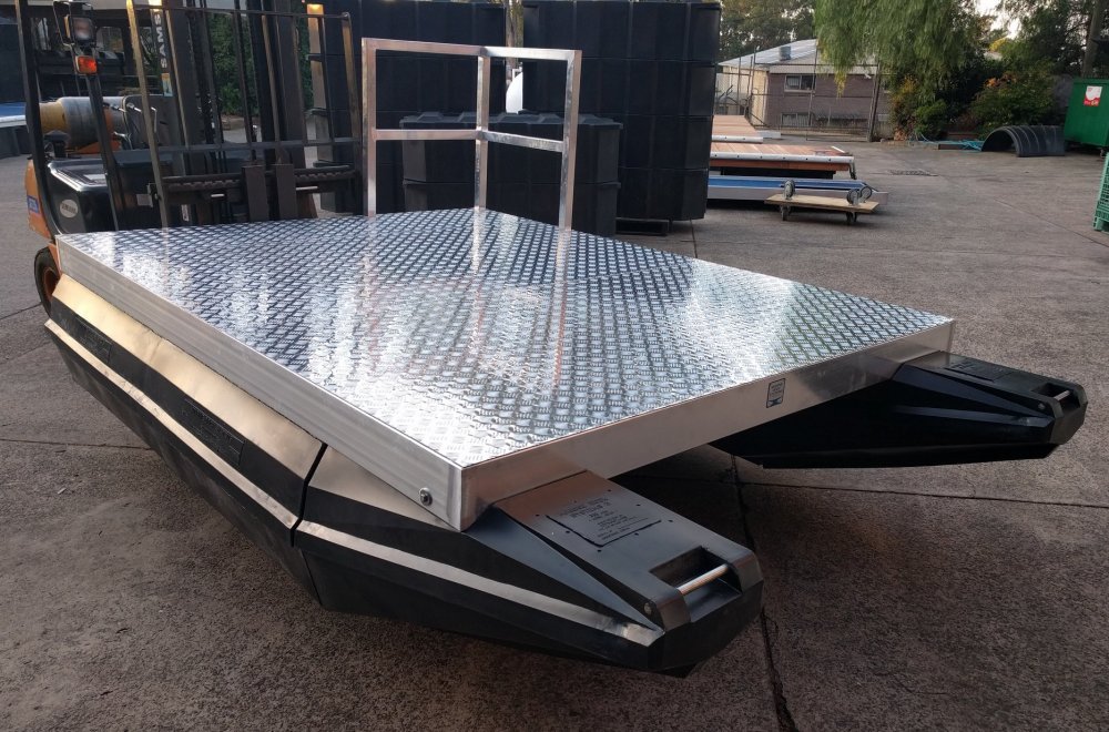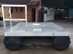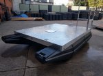 The smallest pontoon boat in our range. Marine Dock Systems has manufactured a few of these, they have been used for different applications. Including water testing platforms, bridge maintainance, personal fishing boat. This model uses our 333 Litre floats and nose cones. The 333 Litre floats will support 150kgs each. Pontoon modules are moulded in one piece from tough, high stress crack-resistant, thermoplastic polyethylene resin. In built mounting lugs allow direct connection of the modules to the frame work system. Floats are food grade and can be used for drinking water or waste storage. Extra available include motor bracket carpet, mooring cleats, steering wheel console. individual floats are also available and can be purchased separately